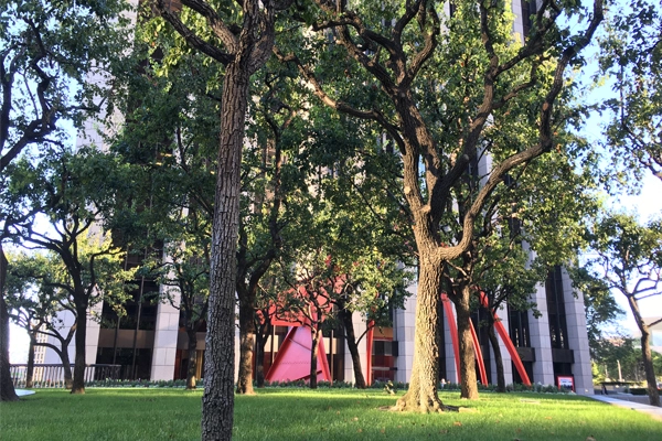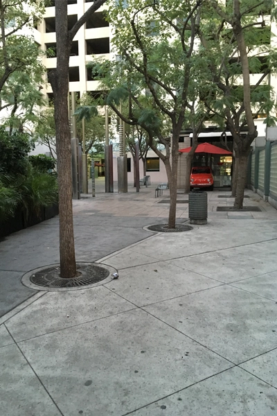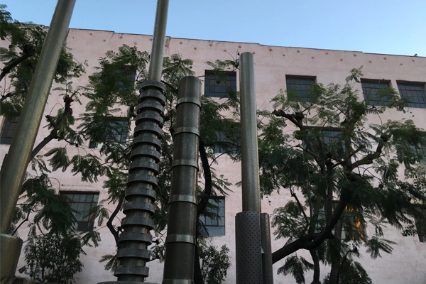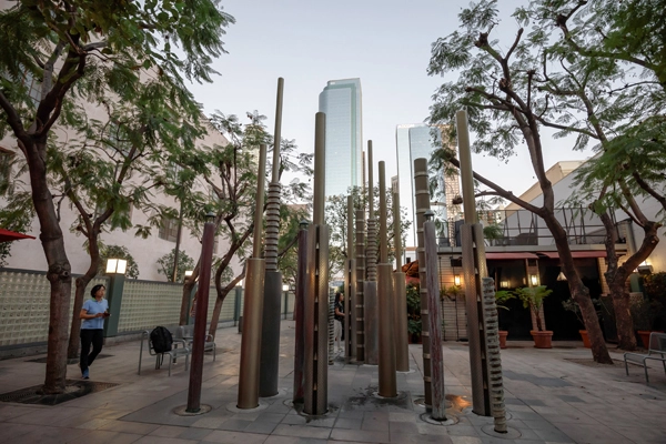 The East-West oriented portion of the park is dominated by a monumental sculpture with industrial character reminiscent of stone quarry drills or skyscrapers. Commissioned by the City of Los Angeles in 1989, the Eino sculpture, titled “Water Columns,” mimics the pattern of the urban skyline.