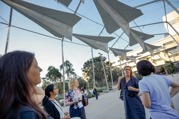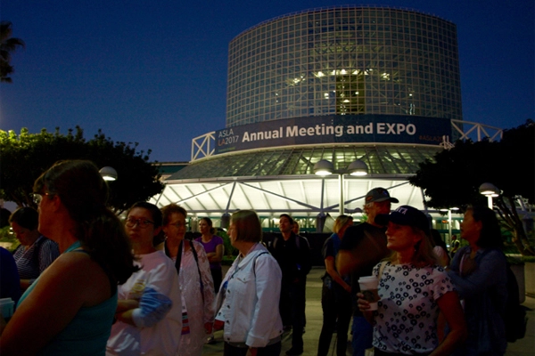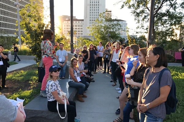 Four Los Angeles landscape architecture projects were highlighted during the 2017 ASLA Annual Meeting’s Women in Landscape Architecture Walk, organized by Stephanie Psomas, ASLA, of Pamela Burton & Company, and the local host chapter, ASLA SoCal. Nearly 80 participants braved the early start time on the final day of the meeting and were rewarded with the rare treat of watching light break over the historic and modern cityscape of downtown Los Angeles.