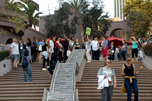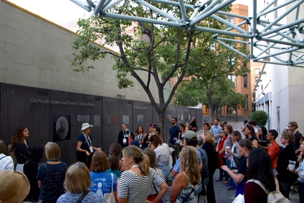 The Maguire Gardens at the Los Angeles Public Library is an oasis, especially for our intrepid tour group on a warm Monday morning in bustling downtown Los Angeles. Graceful Italianate fountains and columnar cypress complement the Art Deco architecture and unique ornamentation of the Library building. Following a group photo opportunity, walkers made their way back to the Los Angeles Convention Center for the final day of meeting sessions.