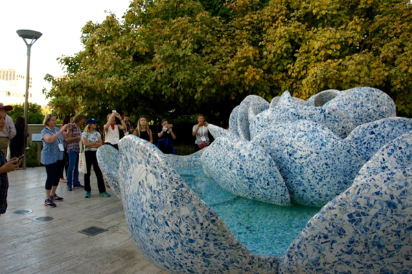 Walking West with the rising grade, visitors encounter the massive, tiered Arthur J. Will Memorial Fountain and a broad gathering space with a cafe and restrooms. Early in the day, the space was cool and dominated by sounds of water from the fountain, and a few members of the walking tour walked out into the shallow water-play portion of the fountain pool.