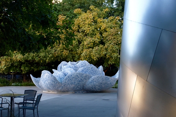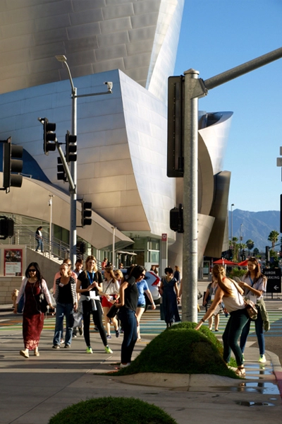 Another unexpected feature of the building is the way it embraces the pedestrian. As the tour proceeded up and around the back of the Concert Hall, walkers were unexpectedly embraced in a lush courtyard scaled carefully to create an intimate sense of privacy. Whimsical plants and trees surround a small clearing with a large mosaic sculpture of a water lily, dedicated to Lillian Disney.