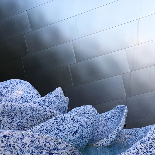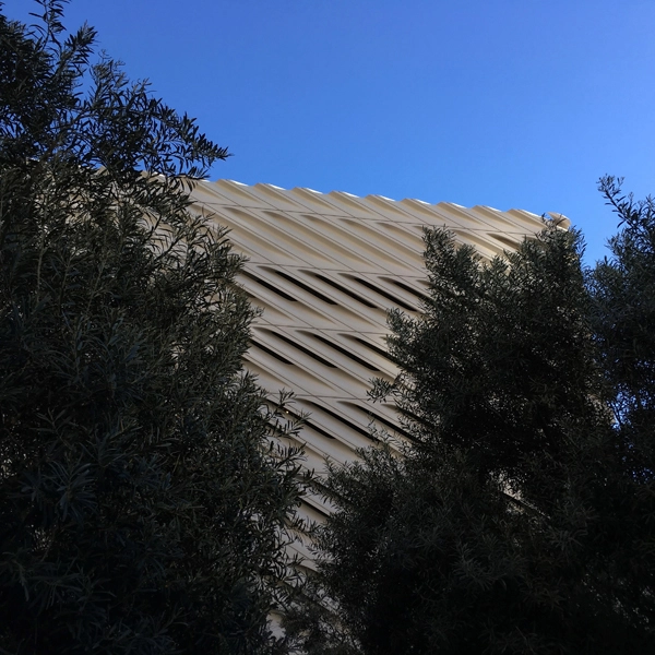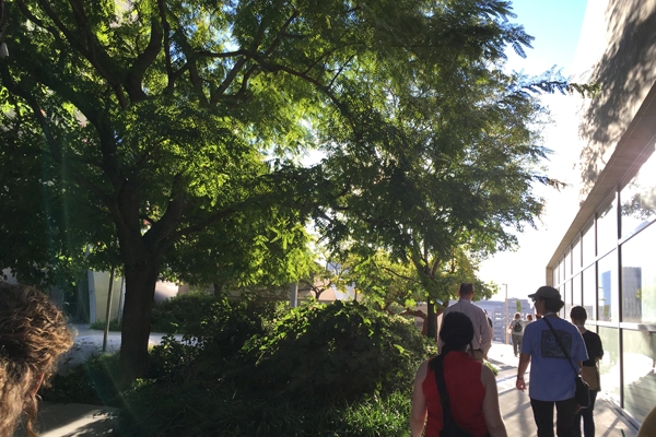 Frank Gehry’s iconic Walt Disney Concert Hall lies at a geographic high point in downtown Los Angeles. Transiting from Grand Park past the arts complex which includes the Los Angeles Music Center, the tour arrived at the Northeast corner of the Concert Hall. The structure itself dynamically reflects the cityscape around it and is sculptural in its approach to light.
