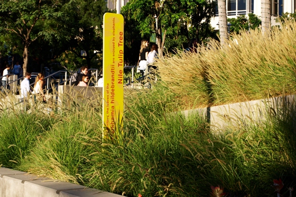 The landscape architecture team at Rios Clementi Hale Studios successfully negotiated the grade change with a series of impressive yet unobtrusive ramps and stairs in a light natural concrete finish. The plant materials are drawn from an international palette and educational signage notes the diverse “Floristic Kingdoms” present throughout the park.