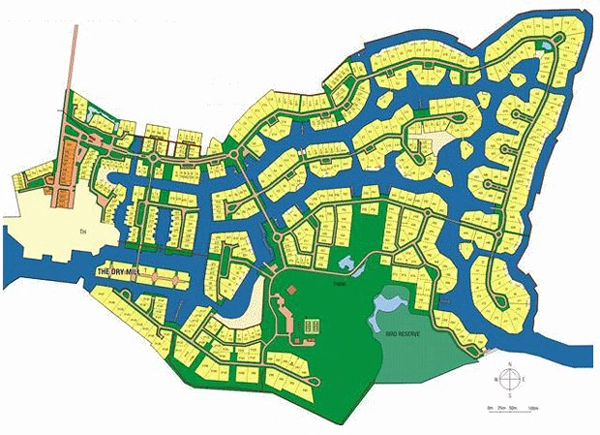 Because the land was so near the water line, tidal fluctuation required that houses had to be sited a meter above the high tide line. This necessitated the excavation of canals for the overburden to be used as fill to raise the island to the required levels. The development is now a series of 19 small islands with a half dozen as individual lot sized islands, connected by 20 arched bridges with both street and water access to homes on private lots.