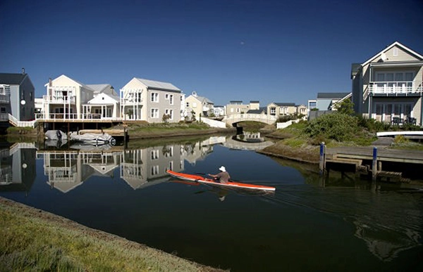 The low-lying island, located in the estuary at the mouth of the Knysna River on the Indian Ocean coast of South Africa, was in the planning, design, and application stages for some 10 years prior to its development. Because the development proposal was so innovative, there was no precedent to assure financial backers of the likely success of such a radical concept. When the property owners were unable to secure the financial backing to undertake the development, Chris Mulder invested everything he owned to finance the development, to include the note to purchase the island. Development finance and three co-investors followed. Over the following seven years, the planner and designer now turned developer struggled to complete the project before the cash flow was exhausted. And, he succeeded.