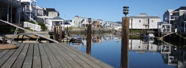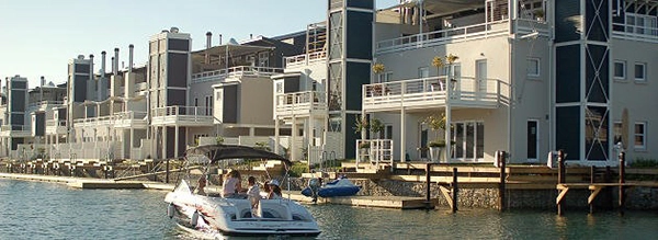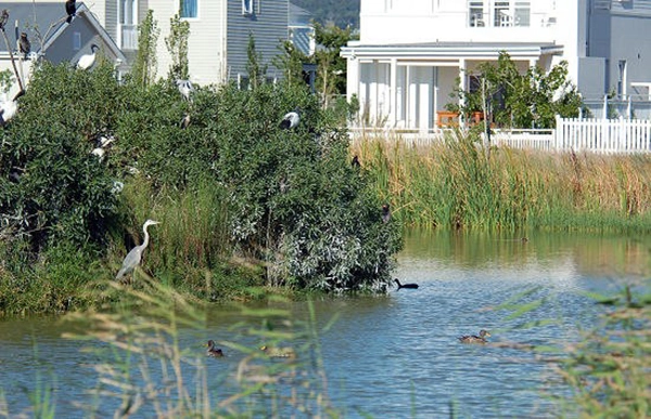 Some of the most significant aspects of the development are the designs for treating the formerly submerged soils of the site and subsequent storm water management of runoff. The dredged fill material had to be dewatered and leached of salt before development to enable plant growth in the community. Today, street runoff water is handled by way of rain garden channels that direct it to man-made wetlands to biologically cleanse the water before it is allowed to reenter the natural system. In addition, the wetlands have been developed into an on-site bird sanctuary with blinds that enable residents to view the wildlife unobserved from secluded vantage points.