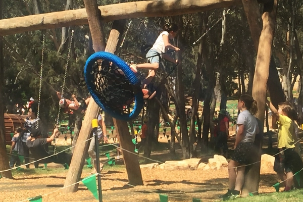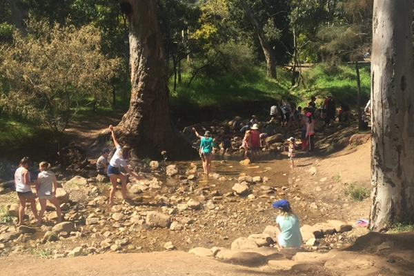 The playspace had just opened within the week preceding our field trip to Morialta, and as luck would have it, the weather was sunny and balmy the day we visited. From the moment we set foot in the Recreation Area, and right there in front of us was Muka Muka Rrinthi in all its splendor, I felt transported back to my childhood. Back then, the activity du jour was to go outside, find some friends, and just figure out, on the spot, what to do…in the cornfield behind our house, the empty lot at the end of the street, or just kick up dirt and create mud cities on the street (our street was not paved until I was well into my teens). We played, hard. I saw this happening all over again. On the day of our visit, the park was packed full with children of all ages, doing what they do best, engaging in spontaneous play, outdoors. “Bubble wrap” removed, this was a playspace full of happily messy, dirty, and soggy wet children outside having a great time, taking good risks, and being tech-free kids.