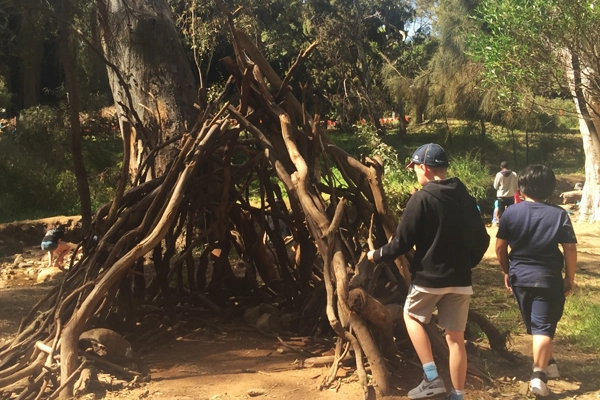 Muka Muka Rrinthi is comprised of five themes: Climbing Boulders, Frog Island, Great Snake, Eagle’s Nest, and Kookaburra Nest. Connecting these themed areas are many meandering paths, trees to touch, explore, and climb, and the most amazing creek (a part of the existing Conservation Park). The play structures are, in fact, works of art, comprised of stone, native trees, and salvaged timber, which seamlessly integrate into the landscape. Nothing looks contrived, including what the children create from loose parts, such as little cubby houses decorated with found objects like flowers and grasses and stones, and ‘beaver’ dams in the creek. There was a dual sense of easiness and purpose that pervaded the nature playspace—hard to describe, but it was there. The children were engrossed in what they were doing and were in the moment. Laughter and chatter was in abundance, and it was evident that problem solving, turn taking, and creativity were in overdrive, but in a good way.