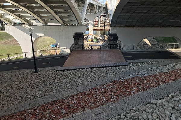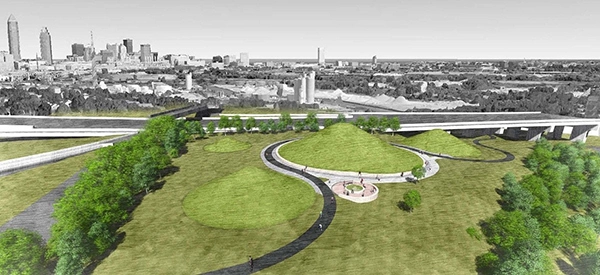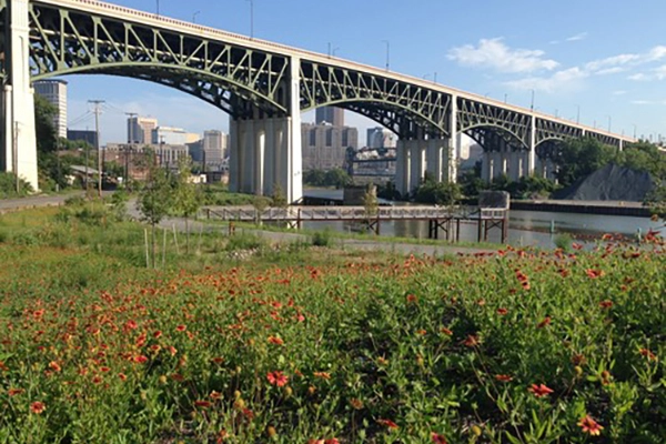 One particular project, the final leg of the Towpath Trail, which spans the entire state of Ohio, is the culmination of a 40-year effort coordinated by many firms. Perhaps the most stunning connection to the Towpath is under the Innerbelt Bridge, with huge chunks of caged rock walls and plantings on 100 foot cliffs. This leads to the low-lying Scranton Flats and future lake link trails. The newfound connection to the river valley has even inspired grandiose land art mounds which reimagined leftover soil.
