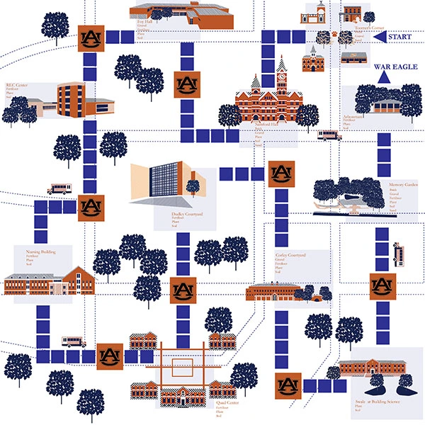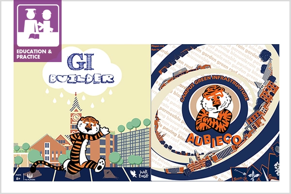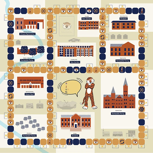 Visitors to Auburn University will now have an opportunity to experience campus green infrastructure using two newly designed interactive board games. The board games, AubieGo and GI Builder were created by Landscape Architecture graduate students for the Office of Sustainability to invite visitors, students, faculty, and beyond to learn about the green infrastructure stormwater control measures that are integrated into the campus landscape. The games provide a novel way to introduce and communicate the benefits of campus green infrastructure practices to both young and old.