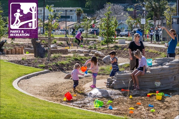 Two new Southern California community parks address learning and play in a natural setting. Although they are equipped with exciting prefabricated spinners, play forts, exercise equipment, and slides, the overall character of each park draws heavily from nearby iconic natural features. Many park activities involve unstructured investigation of the local natural environment.