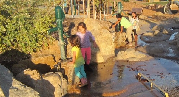 Pinnacles National Park is visible from Greenfield Community Park. A water play area, climbing structures, and plantings draw from the park, with the hope that, as children grow older, they will be attracted to the National Park. Greenfield’s water play area is contained by local boulders and native plants. Water basins, pumps, and a patio with a creek bed offer unstructured passive water play.