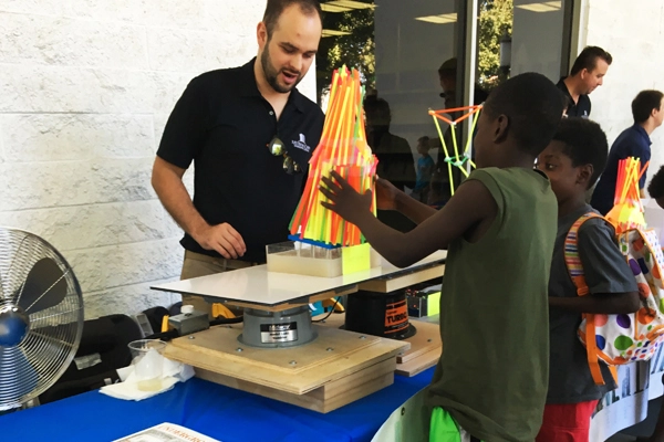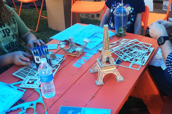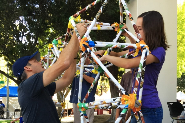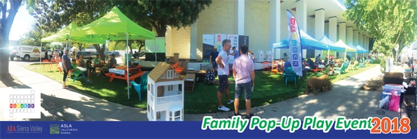 This pop-up play family event was developed by members of the local ASLA and the AIA chapters as a way to involve children and families in the wildly popular Modesto Architecture Festival, a week-long festival celebrating local architecture and design (now branded as MAD Week). The hope was that over time, more of the community would become familiar with the design professions and enjoy what they have to offer. The pop-up play family event is consistently held on the third Saturday of September each year, and this past year was the eighth consecutive year it was held. For months prior to the event, a team of landscape architects, engineers, library staff, architects, and volunteers coordinate and determine how to bring their skills and passions together to best showcase how fun design can be. Those same professionals donate their time and resources as they gather on the day of the event to mentor, guide, and help families learn, play, and enjoy their time together.