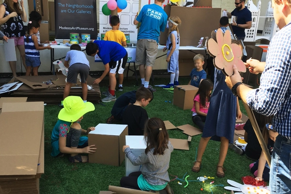 Most autumn Saturday mornings at the downtown library in Modesto, California are decorated with shoppers and families enjoying artisan organic foods and searching for hidden gems and trinkets at a seasonal farmer’s market along a closed-off section of 17th Street. There is always plenty of music, food, and social dialogue, and everyone enjoys themselves. Once a year, however, this same location is overtaken with laughter, giggles, and smiles as hundreds of families and children swarm the area, overshadowing the events of the farmer’s market, to participate in an annual pop-up play event meant to raise awareness within the community about the design industries.