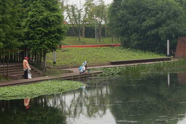 Their response has been the wetland park concept. The wetland park addresses the multiple objectives of managing and treating stormwater, providing for critically needed public park and open space resources, and remediating groundwater and riverine pollution. In Shanghai the pioneering Houtan Park by Turenscape restored 33 acres of the Huang Pu river waterfront for public recreation, remediated a former industrial site, and serves as a stormwater management and treatment facility for the 2 sq. mile Expo 2010 site. During non-rain periods, while thousands of Shanghai residents enjoy the 1.3 miles of waterfront recreation, polluted water from the Huang Pu is diverted into the park’s wetlands for treatment and discharged back into the environment.
