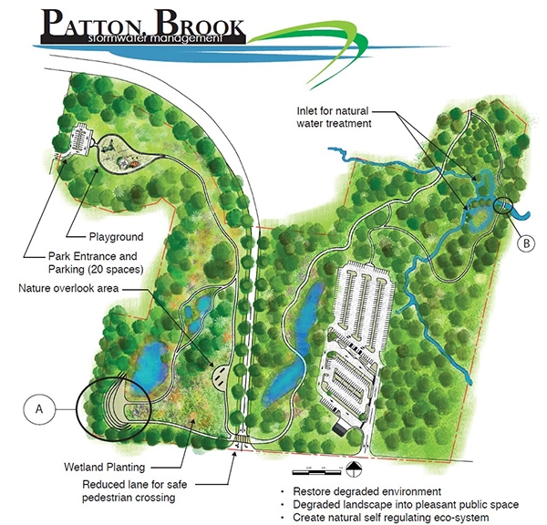 The new plan proposes to eliminate the multiple privately owned and maintained systems that are the norm with a single large, publicly owned and financed facility. Two low-lying areas totaling about 18 acres that are unsuited for development and that also include small wetland complexes and a riparian corridor, would be developed as stormwater management facilities and wetland preserves. These preserves would be naturalistic landscapes that would include constructed wetland areas to manage and treat stormwater.