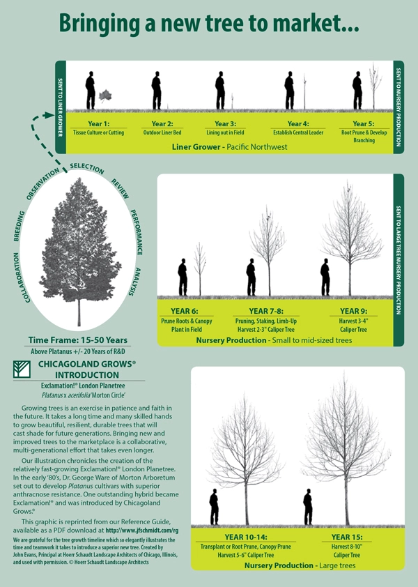 The complex timeline for bringing specimen trees to market is made simple via this elegant graphic shared with Plant Design PPN participants. / image: created by Hoerr Schaudt Landscape Architects of Chicago for an iLandscape educational session, it is adapted for the J. Frank Schmidt Reference Guide by permission. Available to download from the J. Frank Schmidt & Son Co. website.