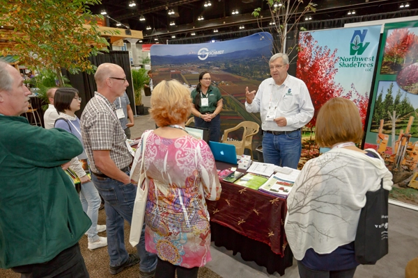 Martin Hanni of Northwest Shade Trees describes production steps for developing strong branch attachment and canopy structure in a Metro Gold® Maple. Joan Cartwright of J. Frank Schmidt & Son Co. and Planting Design PPN EXPO tour participants look on. / image: EPNAC