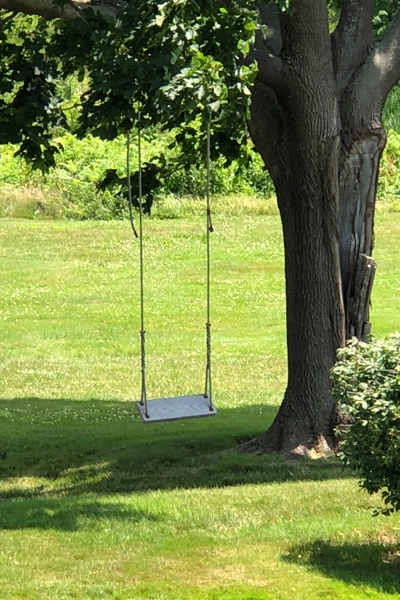 [Growing up], we found the typical swings really boring unless we were jumping out of them to see who could launch the furthest. We had two other types in Charlotte in the 1960s/70s. One was a “Maypole” kind of thing. These were extraordinarily fun and you had to wait for an open swing—sometimes too long and we would leave disappointed. I’ve heard stories of kids getting hurt, but we never experienced or witnessed any injuries. The other kind of swing was one in which you sat in a cage and pumped two bars with your hands. Boring! I can’t even find a picture of them on the Internet.We mostly spent time on rope swings in backyards or in the “woods” near the neighborhood. These were never tire swings but were either a “t-seat” made of wood with the rope passing through a hole in the middle of the board. You’d startle the board with the rope between your legs, holding on to the rope with two hands. We wound ourselves around the big oak tree truck and spun out in an arc away from the tree and then returned to wrap around the truck the other way. You could do “tricks”—spinning fast or slowly depending on how you extended or tucked your legs.