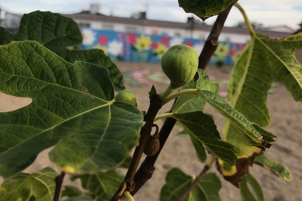 Under my wide brimmed hat, with sweat dripping, I added paint, stroke by stroke, to the long wall. My legs burned sitting on the decomposed granite roasting in the hot sun. I sipped Cool Blue Frost Gatorade, hunger dissipated by 110° heat. A giant cottonwood shaded the playground in the afternoon, but at midday there was nowhere to hide. I looked behind me. Pavers in bright pink and green lay scattered about. Soon I would have to muster the energy to dig up the remaining pavers, wincing at the first attempt to lay a labyrinth. Next to the pavers, the newly planted Desert King fig reflected bright green fruit, leaves wilted trying to send all its efforts in the heat to its future. “Will these figs be around when the kids come back for school?” “Will I ever finish painting this wall?” Why did I get myself into this mess?”