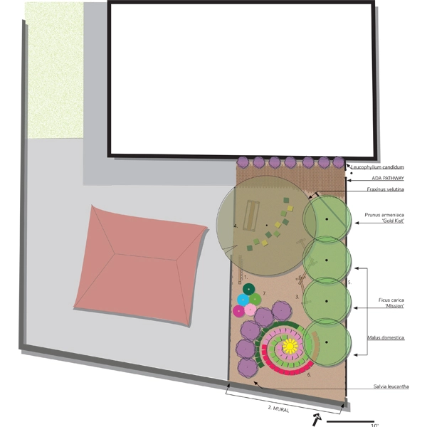 My background in landscape architecture provided tools to create plans and design. Using playground design principles intended to improve students’ physical and mental health was a goal. Varied types of balance beams were cheap and easy to build. A labyrinth could be a beautiful discovery, surrounded by native plants and a colorful mural. Incorporating sensory elements like a large xylophone and fruit trees stimulate and appeal to children.
