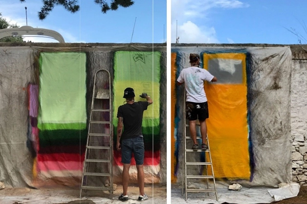 Quintessenz过往的一些项目涉及“漂浮艺术”,网状彩色织物的层叠。作品创造出看似漂浮在空中的色彩渐变波浪,并且随着风和光的变化不断改变它们的外观形态。例如他们在希腊美丽的Paxos岛上某处古建筑废墟创作的“卡卡西卡的秘密”。 这个地点原本就有自己独特的魔力。人们欣赏建筑本身的同时,也可透过窗框瞭望远处的美景。Quintessenz通过他们的装置更为强调了非常强烈的视觉体验。