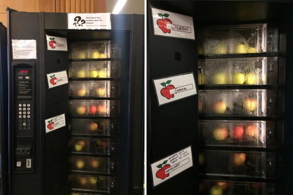 I have been thinking about vending machines since last year when I attended and presented at the National Children’s Youth Gardening Conference hosted at Cornell University. What is my inspiration? Located in the lobby of the Mann Library is a vending machine loaded with fresh apples. Graduate students in the Horticulture Program pick the apples from the Cornell and Horticulture Section’s Lansing Orchards and keep the machine well stocked. Proceeds from sales benefit the Society for Horticulture Graduate Student Association.
