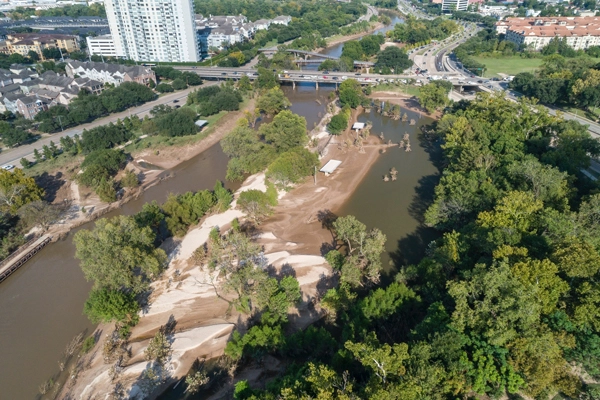 In describing some of his observations of the bayou from above, Jonnu stated: “The sheer volume of sediment and debris that was deposited along the banks of the bayou was amazing to witness first-hand. In some spots where the bayou twisted its way towards downtown, the silt had accumulated so much that it engulfed entire sections of the park and trail network in four feet of impassable quicksand-like sediment. Vegetation took a substantial hit, not just from the water’s thrashing, but also from being submerged for such a prolonged period of time. Very few sections of the lower trails were passable, but Houstonians are resilient folks and I noticed quite a few locals determined to get in their afternoon jog along the bayou regardless.” In a new way, the UAV allowed SWA to safely assess the impact of Hurricane Harvey on its projects in near-real time, providing a new method for quickly collecting qualitative data on floodwater, material damage, sediment accumulation, and vegetation.