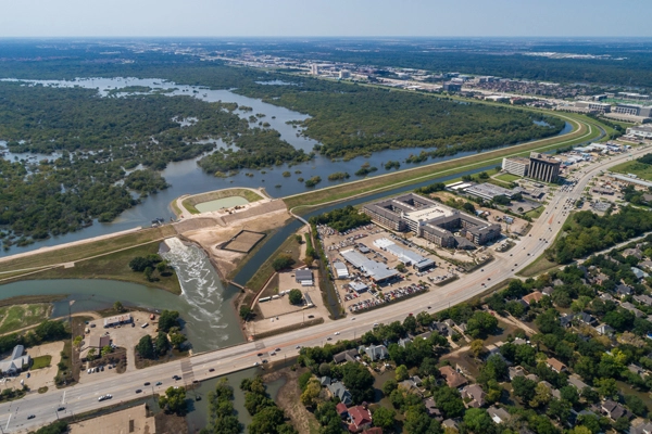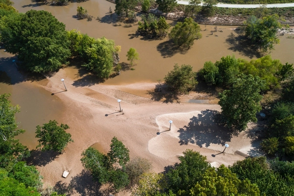 At SWA, the imaging team led by David Lloyd has been working with UAVs for the past three years. In the beginning, their primary objective was, like many others, to capture images and video of recently constructed projects from a new angle. Then, in 2017, Hurricane Harvey hit. The catastrophic storm stalled for four days over southeastern Texas, dropping more than 60 inches of rain across the landscape. In Houston, this sustained downpour caused unprecedented swelling in the Addicks and Barker reservoirs, prompting the Harris County Flood Control District to release the water into the Buffalo Bayou, a meandering slow-moving river that snakes its way through downtown. Having been involved in the planning and design of many projects along the bayou, designers at SWA were anxious to understand the impact of the storm on their designed-to-flood efforts.