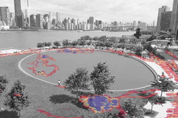 Since Harvey, SWA’s research and innovation lab, XL, has begun collaborating with the firm’s imaging team to explore new ways that UAVs could function as analytical tools for design and evaluation. This effort is a part of the lab’s visualization and simulation track, which experiments with and critically evaluates various emerging tools to better understand their potential for the fields of landscape architecture, urban planning, and urban design. Most recently, XL Lab worked with Bill Tatham, another in-house photographer at SWA, to experiment with UAVs in assessing the performance of Hunter’s Point South Waterfront Park, Phase I, which was designed by Thomas Balsley Associates (now SWA/Balsley) and Weiss/Manfredi, with ARUP as a prime consultant. One output of the study was an experimental heat map indicating areas of high and low occupation across the park, created using drone footage and a machine-learning algorithm.