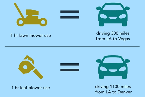 One way to think about the air and noise effects of these small gasoline-powered engines is to compare them to average car exhaust. Running a typical leaf blower engine for one hour can produce similar levels of pollution as driving 11 new cars for that same hour. Considering that yard crews often have two or three engines running at once (trimmers, blowers, and mowers, for example), this could be like having 22-33 parked cars with their engines racing parked around your house or business! The chart below compares the best-selling leaf blower and lawn mower to driving a 2017 Toyota Camry, the best-selling car in the U.S. in 2017.
