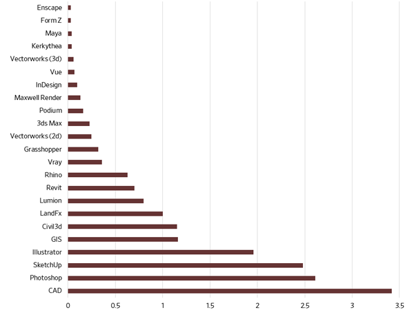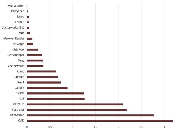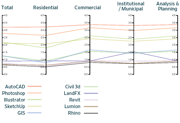 This data provides a detailed picture of the current state of software use in the profession and enables an analysis of how software usage varies across the discipline. Not unexpectedly, the results of the study indicate that AutoCAD, Photoshop, Illustrator, and SketchUp are the most commonly used and most important software packages in the profession. However, when factoring in the type of projects that a firm works on, this ranking changes and other software, such as GIS, Revit, Rhino, and Civil3d, become more prominent. There is also variability in what software is used based on the geographic location of the firm. Larger firms are also more likely to use and value a broader range of software applications. The survey also found that individual emerging technologies are closely related, indicating that some firms are very entrepreneurial in adopting new technologies.