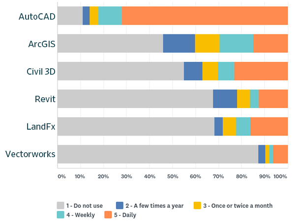Last year, the Digital Technology Professional Practice Network (PPN) leadership team released a survey to gather information about available technology applications currently used by landscape architects to operate effectively and efficiently. In collaboration with professors Benjamin George, ASLA (Utah State University), and Peter Summerlin, ASLA (Mississippi State University), PPN co-chairs Matt Wilkins, ASLA, Eric Gilbey, ASLA, and officer Nate Qualls, ASLA, collected over 480 responses, capturing the industry’s current state of software usage.