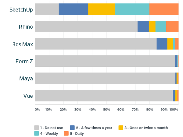 Software and technology are thoroughly entrenched as an essential tool for designers. However, there are many available options vying for designer’s attention and use, and it is often difficult to assess and understand the ramifications of adopting certain software packages. For educators, working to prepare students to become future practitioners, it is important to understand how software is being used in the profession in order to better train their students. For practitioners, these results may inform decisions on software investment or adoption of emerging technologies for your practice.