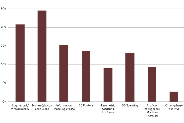 - Investment in emerging technologies is clustered together, and firms that are willing to invest in one emerging technology are more likely to invest in other emerging technologies. Drones and BIM use were very highly correlated.