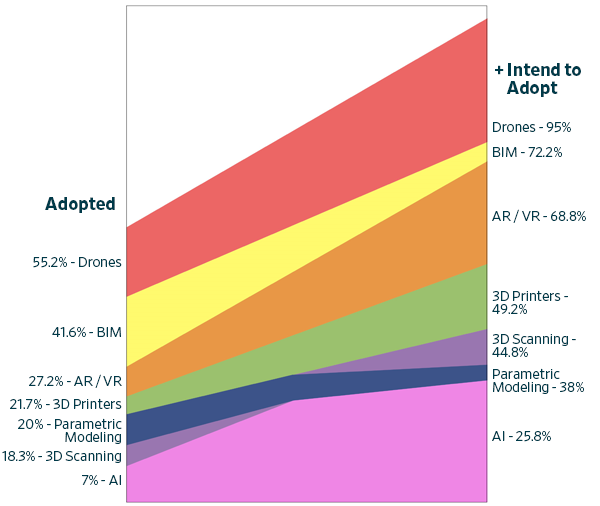 - Companies that take active efforts to hire trained professionals or to train in-house are more likely to be using VR/AR, drones, and BIM. Firms that have used this training method also have a high correlation with interest in adopting emerging technology. Firms that expect employees to train themselves have a high interest in adopting, but among self-training firms that have adopted these technologies they actually have a negative correlation regarding the value. This would suggest that relying on staff to self-train on emerging technologies will produce less effective results and that firms need to invest in training if they are serious about adopting new technologies.