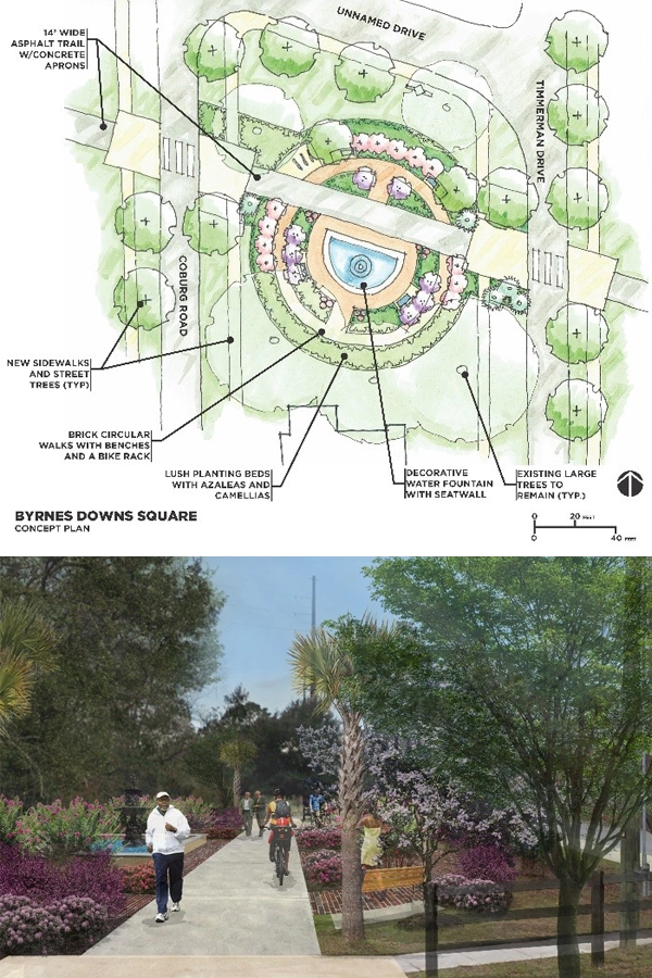 An example of a quick, charrette-produced plan to make an existing roadway more bicycle and pedestrian friendly, and an existing parking lot more of a park-like place. / image: Daniel Ashworth