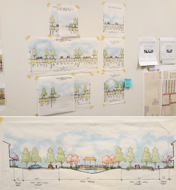 I hope this two-part series of my perspective as a landscape architect working in multi-disciplinary design charette teams is helpful for those working in or interested in charrettes. In this environment, graphics and analysis exhibits are drawn up quickly and a landscape architect working in the charrette process has to keep up with the flow of things and stay on top of production tasks, especially as things change with public input. Hopefully as a result of this series, more landscape architects improve their graphics skills and take steps to participate in, and even lead, more design charrettes.