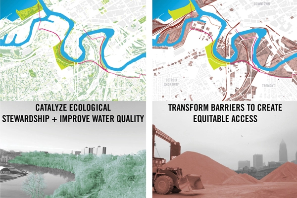 ASLA 2019 Professional Honor Award in Analysis and Planning. The Cleveland Flats Connections Plan: Connecting a Missing Link. Cleveland, OH. CMG Landscape Architecture / image: Design Workshop, Inc. / images: CMG Landscape Architecture; site: Scott Cattaffa; historic: James Thomas