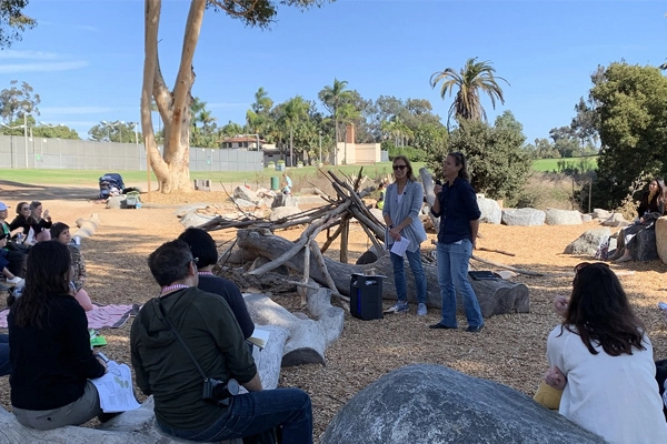 Next, we headed to Balboa Park to enjoy a picnic style lunch while watching several preschool groups enjoy the City of San Diego’s first nature exploration area (NEA). Shamli Tarbell, Park Landscape Architect, and Kathy Castello, Area Manager with the City of San Diego Parks and Recreation, facilitated an excellent presentation on the project. Topics included: design guidelines for nature play, obstacles in the process, and what it took to get the first NEA installed in San Diego.