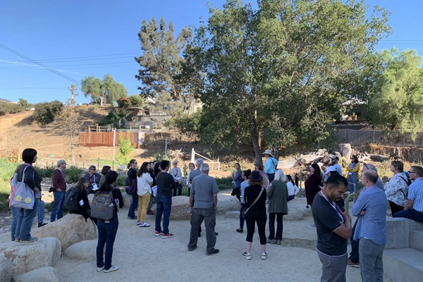 From the Hilltop CDC, the field session headed to the community of Encanto in South East San Diego to visit the EarthLab, run by Groundwork San Diego/Chollas Creek. Education Director Joanna Proctor led the group through the project site, which included a native garden/pocket park, outdoor learning amphitheater, educational creek bed, production gardens, and newly installed accessible pathways. An engaging discussion about partnerships with the school district and community, and curricular connections, took place.