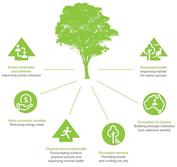 In Melbourne, Australia, due to a warming climate and decade-long drought, city officials set out on an aggressive 20-year urban forestry strategy aiming to double tree canopies by 2040. Since adopting the plan in 2012, Melbourne has planted nearly 12,000 new trees and mapped the species and health assessment of 70,000 others. This data allowed them to start diversifying their tree stock with a goal of providing no more than 5% of any one tree species, no more than 10% of any genus, and no more than 20% of any one tree family. This diversification means Melbourne will enjoy a vibrant tree canopy for decades to come, and one that is not nearly as susceptible to infections and die-off of certain tree species or genuses. City officials also believe this effort will help cool the city’s urban summertime temperatures by 4 degrees Celsius or more than a whopping 10 degrees Fahrenheit! Melbourne even put together a full-on urban forest manual to solidify their serious approach to urban forestry and urban quality of life (see summary graphic below).