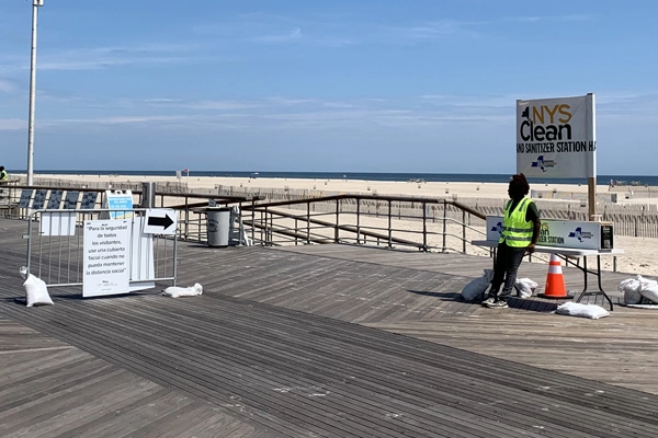 Signage and hand sanitizer abounds on the Jones Beach Boardwalk on Long Island. / image: Alexandra Hay