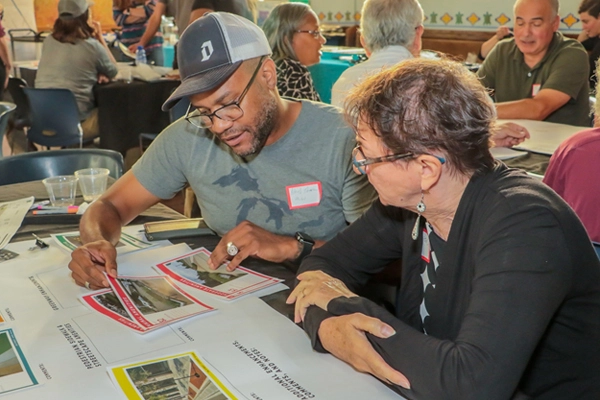 Description: The room is organized into groups of 5-7, each around a table with topical boards and a deck of amenity cards. Topical boards (On-Street Greenway, Off-Street Greenway) each have a total budget identified, and several categories of amenities that must be selected to fulfill both functional needs and community desires for the greenway corridor. Each amenity card includes a ‘cost’. Participants must collectively select the amenities to meet their priorities, while working within the identified budget. Through individuals exercising both advocacy and compromise, each group negotiates to reach consensus. A spokesperson is selected from each group who shares a summary of what was decided and how they came to agreement.