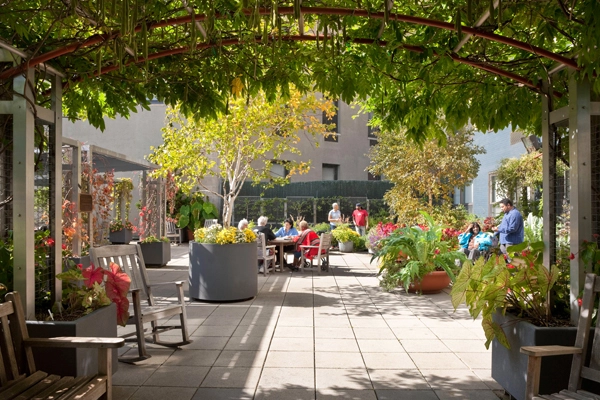 So much of the firm’s philosophy and methodology was forged during the design of the Schnaper Garden at the Terence Cardinal Cooke Health Care Center. If design is a form of problem solving, the challenge of formulating a design response to AIDS was ignorance. Defining the problem became the problem; there was no design (and little medical) research to draw upon. I started simply by observing and talking with everyone I could—doctors, nurses, family members, and the patients themselves—in order to understand the physiological, emotional, and psychological challenges this disease presented. The challenges for this rooftop garden were not so much technical as something more intimate: addressing the human condition in all its particularities.
