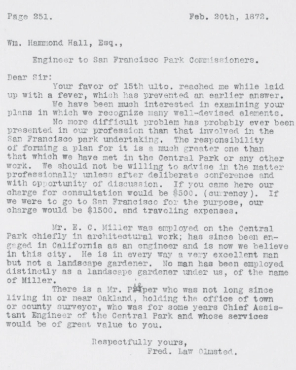 While the supervisors and mayor of San Francisco were focused on directing development of San Francisco outwards to the Pacific Ocean, where land could be acquired relatively easily for their purposes, Frederick Law Olmsted's report, to the contrary, wished to develop a park in what is now known as Lower Haight / Hayes Valley and City Hall, with a broad parkway connecting the Bay to the interior, along what is now Van Ness Ave.