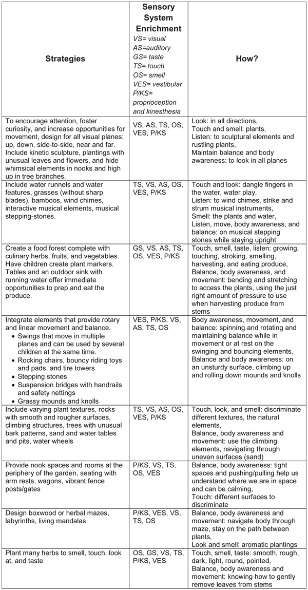 If being outdoors is a positive and protective factor in the lives of older adults, it seems logical that it matters throughout our lives, starting in early childhood. It gives us more reasons to encourage access for everyone of all abilities, ages, and cultural backgrounds to have easy, abundant, and meaningful opportunity for sensory play in outdoor spaces. We include a figure below (originally published in a 2016 Children's Outdoor Environments PPN article called Sensory Gardens) that Amy and a former student, Kristen Singley, wrote, to help you understand what each of the sensory systems are. Each system needs to be considered when designing impactful sensory rich outdoor spaces.