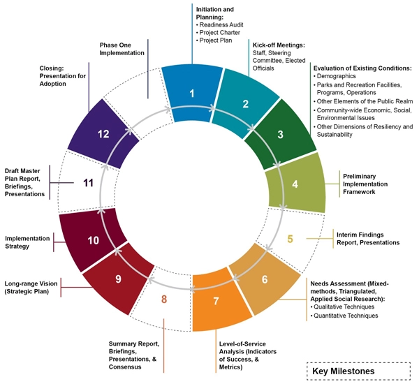 Next, the proposed approach includes a ‘preliminary implementation framework (PIF)’ to initiate implementation discussions as early in the process as possible; traditional processes often leave implementation discussions for last, which can doom the project to failure. The PIF is particularly important for plans that address numerous dimensions which will be implemented by agencies other than a parks and recreation or planning department. In addition to traditional forms of implementation—such as capital improvements, additional staffing, new programs, and increased maintenance—the PIF may also include updates to comprehensive plans or land development regulations; partnerships with other agencies, businesses, or nonprofit organizations; and changes to organizational structure or staffing, programming, operations, and maintenance.