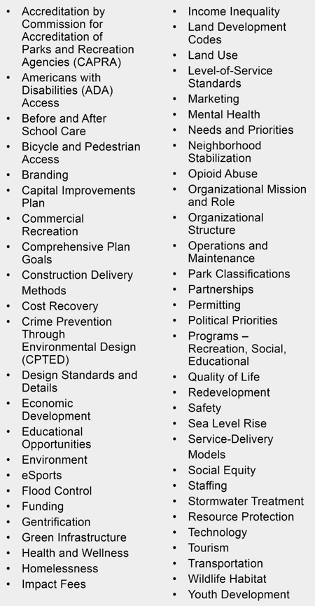 - considering alternative dimensions of parks and recreation systems, such as social equity and climate change, from the onset of the planning process; and