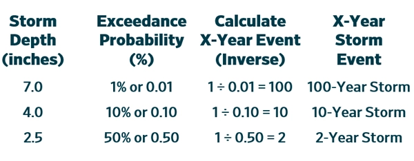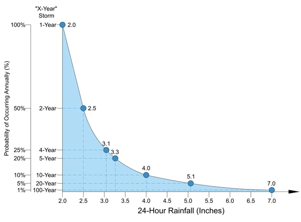 A typical chart (called a probability distribution; see Figure 1 above) shows that the probability of a storm exceeding 7.0 inches (1% chance) is less likely to occur each year than a storm exceeding 4.0 inches (10% chance), which in turn is less likely to occur than a storm exceeding 2.5 inches (50% chance). Since dealing in probabilities tends to drive math-phobic people away, a gentler way to present exceedance probability is to take its inverse, or take 1 and divide it by the probability: